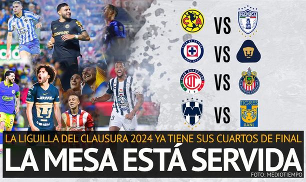 De esta forma, estos serán los cuatro enfrentamientos para la primera fase de la Liguilla del Clausura 2024, los cuales llevarán a cabo sus Idas entre miércoles y jueves, mientras que las Vueltas serán el próximo fin de semana. Este lunes se anunciarán las fechas y horarios oficiales de cada uno de los ocho partidos con los que se abre la Fiesta Grande. Cabe mencionar que en caso de empate global avanzará el mejor clasificado. América (1) vs. Pachuca (8) Cruz Azul (2) vs. Pumas (7) Toluca (3) vs. Chivas (6) Monterrey (4) vs. Tigres (5)