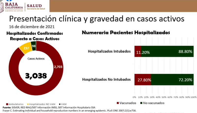 TIJUANAbaja california, 17 de diciembre 2021.- Son 3,038 los casos activos de Covid-19 en Baja California, de ellos, 237 refieren a personas hospitalizadas y 98 intubadas, explicó Néstor Hernández Milán, titular de la Unidad de Evaluación y Seguimiento de ISESALUD.