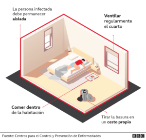 La puerta del cuarto donde duerme el enfermo debe mantenerse cerrada. Es importante abrir la ventana para dejar que circule el aire. Sus comidas debe hacerlas allí dentro, y todo la basura que genere (pañuelos descartables, mascarillas, etc.) debe tirarla a un bote con una bolsa plástica y cerrarla.