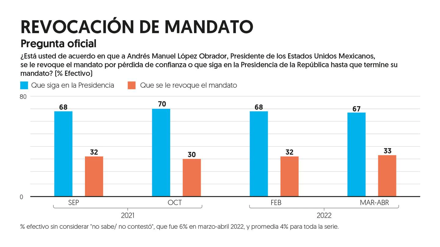 El 67 por ciento de los mexicanos está de acuerdo con que el presidente Andrés Manuel López Obrador siga en la Presidencia hasta que termine su mandato, mientras que 33 por ciento prefiere revocarle el mandato por pérdida de confianza. Así lo revela una encuesta nacional de EL FINANCIERO realizada a mil 500 adultos vía telefónica, en marzo y los primeros días de abril.