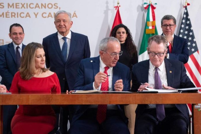 Las delegaciones negociadoras de Estados Unidos, Canadá y México firmaron este martes en Palacio Nacional el protocolo modificatorio al Tratado entre México, Estados Unidos y Canadá, (T-MEC), luego de alcanzar un acuerdo en la aplicación del tratado.