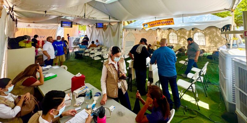 Adrián Medina Amarillas, Secretario de Salud, informó que se extendió el espacio con el fin de ingresar camillas y sillas para las áreas de descanso, con una capacidad para 60 personas. Asimismo, continúan los servicios de consulta médica, regaderas, agua potable y Suero Vida Oral gratuitos, para estos grupos de personas que diariamente visitan el punto ubicado en parque del Mariachi, en la zona centro de Mexicali.