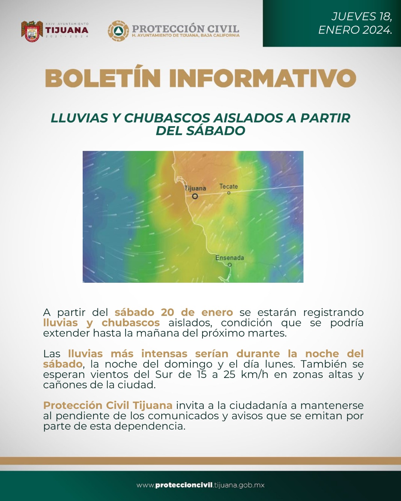 Anuncia ProtecciUn Civil, lluvias y chubascos a partir del sábado y podrían extenderse hasta el martes 23 de enero