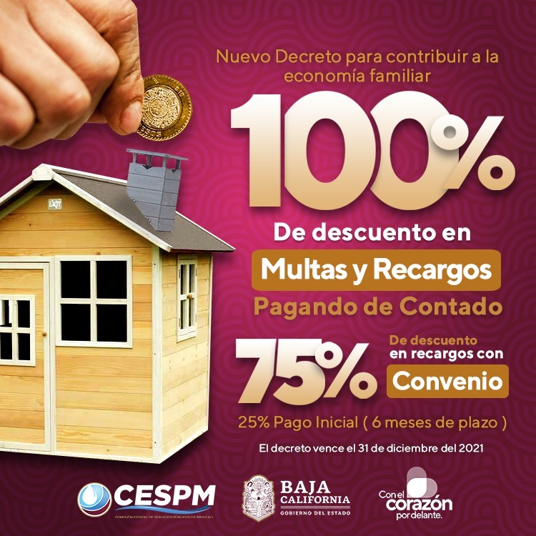 MEXICALI. – La Comisión Estatal de Servicios Públicos de Mexicali (CESPM) invita a los usuarios del servicio doméstico del agua potable a aprovechar el Decreto de la Gobernadora de Baja California, Marina del Pilar Avila Olmeda, sobre multas y recargos en el servicio medido del agua, que estará vigente hasta el 31 de diciembre del 2021.