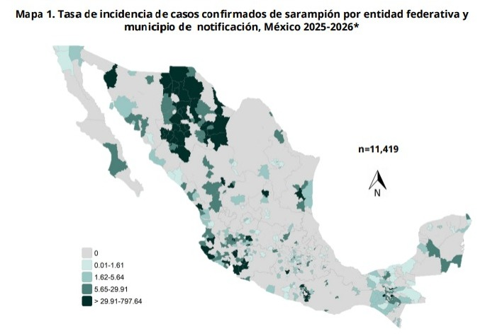 A nivel nacional, el número de casos confirmados de sarampión sumó 11 mil 419 en el acumulado (2025-2026) Chihuahua, con 4 mil 513 y Jalisco, con 3 mil 603 son las entidades que concentran el mayor número de casos confirmados.