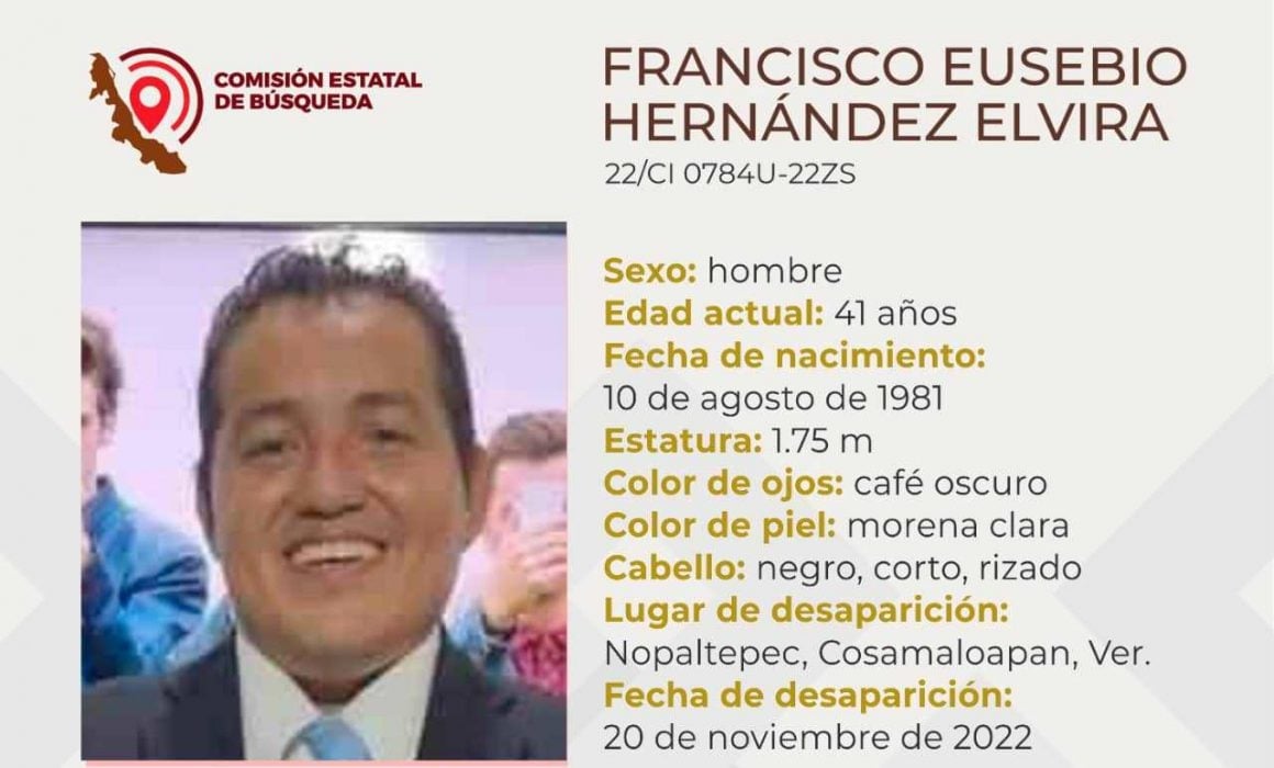 XALAPA, Ver., 22 de noviembre de 2022.- Familiares denunciaron la desaparición de Francisco Eusebio Hernández Elvira, dirigente del Club de Periodistas de Ciudad Isla, Veracruz, desde el pasado domingo 20 de noviembre.
