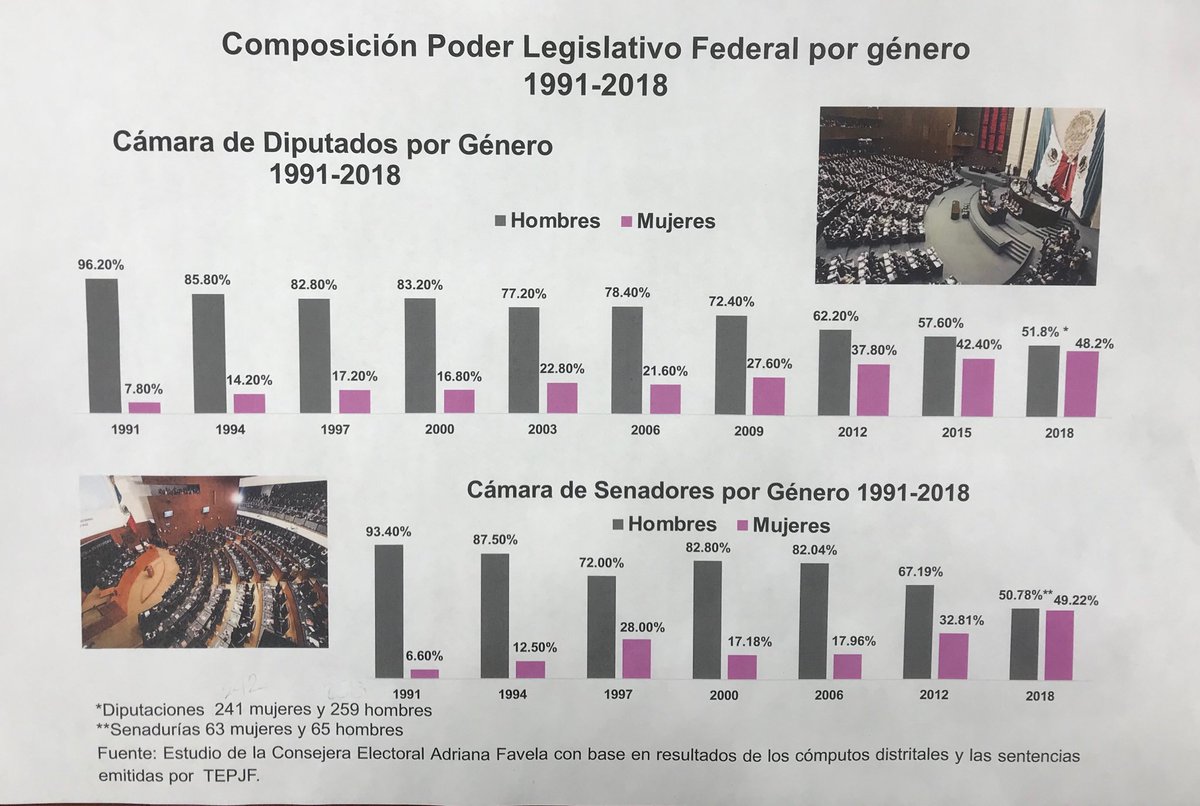 Se destacó en la sesión que en la Cámara de Diputados el 48 por ciento de las curules serán ocupadas por mujeres mientras que en el Senado será el 49.22 por ciento.