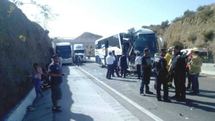 TECATE,BAJA CALIFORNIA, 19 MAYO 2018/Siete pasajeros resultaron heridas al chocar el autobús de la línea Agua Caliente, en el que viajaba la tarde de este sábado a la altura del Hongo.