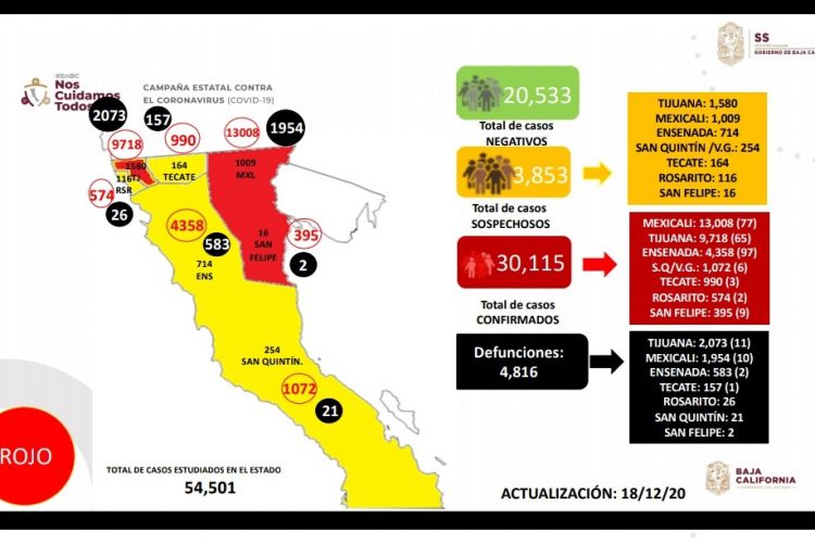 la Secretaría de Salud (SS) en el estado confirmó que ya son 30 mil 115 los infectados por el virus del SARS-CoV-2.Van 4 mil 816 muertos en todo el estado de Baja California. Las personas que murieron mayores a los 60 años representan 2 mil 722 . Los hombres que han muerto por la COVID-19 son 2 mil 889 y las mujeres representan mil 927 casos.