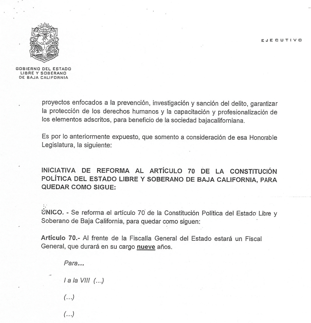 La finalidad de esta reforma, justificó en el documento, es armonizar la gestión del titular con la del titular de la FGR y “dar continuidad a las estrategias, programa, proyectos enfocados a la prevención, investigación y sanción del delito, garantizar la protección de los derechos humanos y la capacitación y profesionalización de los elementos adscritos” en beneficio de la sociedad bajacaliforniana.