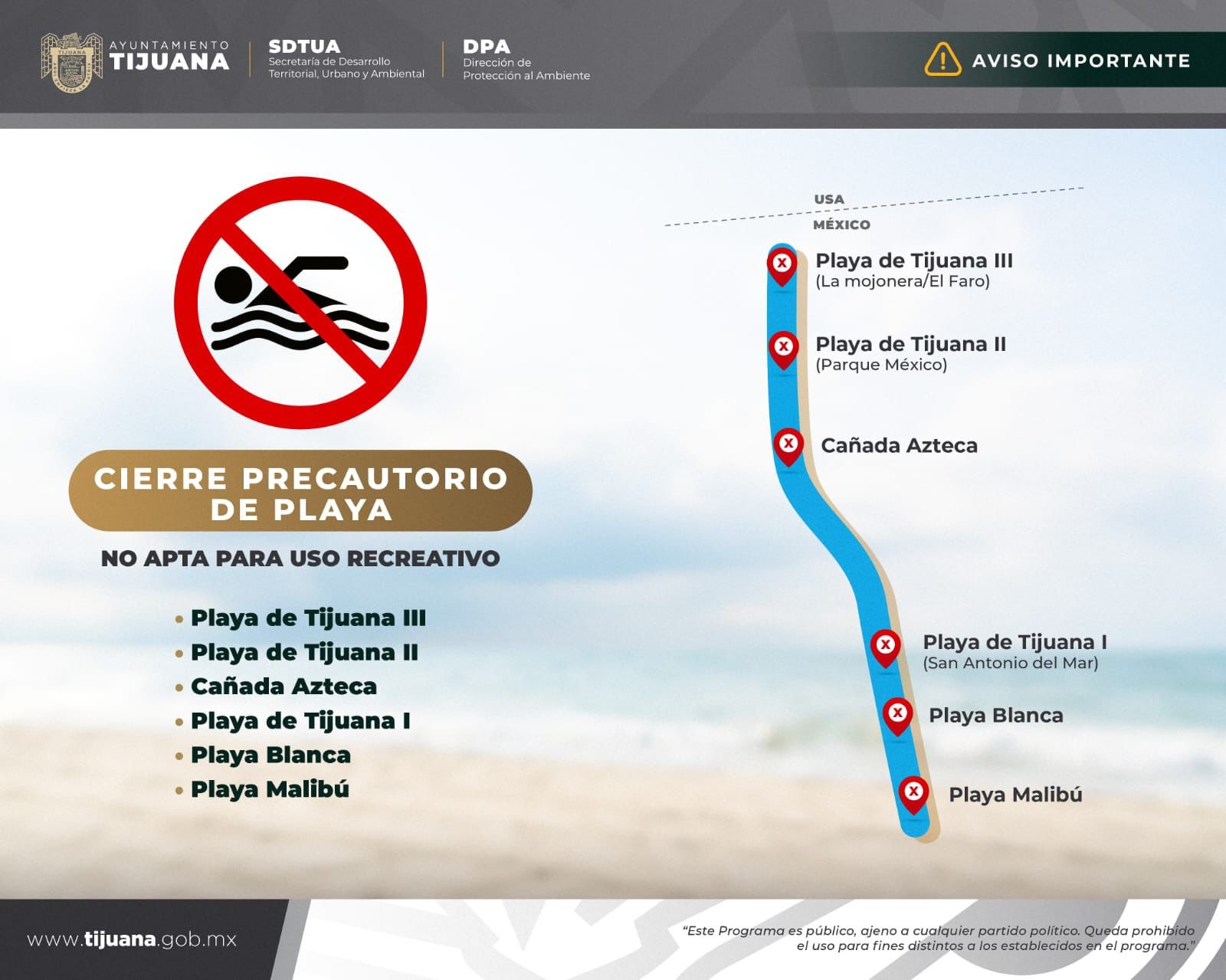 Las playas que permanecerán cerradas y con letreros informativos serán, Tijuana I (San Antonio del Mar), Baja Malibú, Playa Blanca, Tijuana II (Parque México), Tijuana III ( La Mojonera/ El Faro) y Cañada Azteca, por lo que se le solicita a los visitantes tomar sus precauciones.