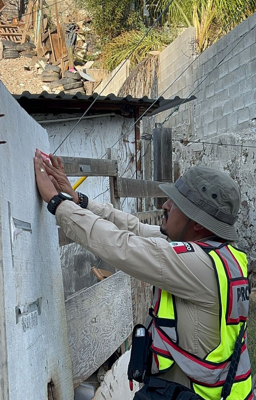Tijuana, Baja California, a 23 de octubre de 2025. El gobierno del presidente municipal , a través de la Dirección Municipal de Protección Civil, colocó engomados rojos de alto riesgo en siete viviendas de madera instaladas sobre un acueducto de la colonia Vista Alamar, en la delegación Otay Centenario.