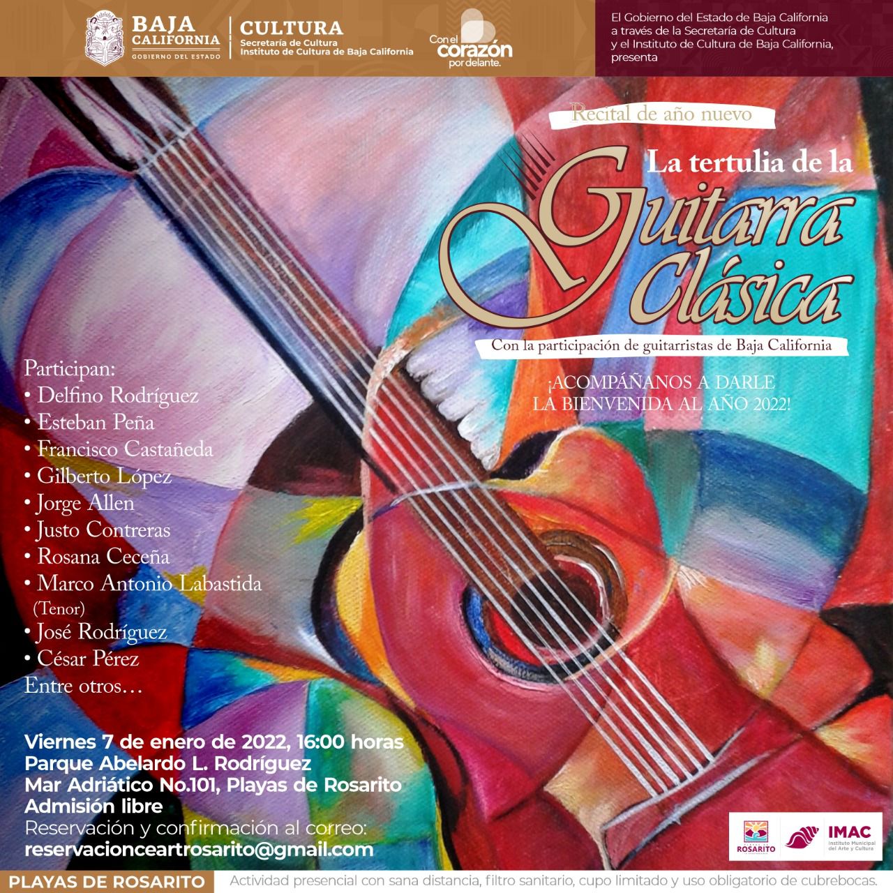Indicó que esta tertulia de la guitarra clásica se realizará el viernes 7 de enero de 2022 en el parque Abelardo L. Rodríguez, ubicado en Mar Adriático 101, iniciando a las 4:00 de la tarde y hasta las 6:30. El evento está dirigido a un público familiar.