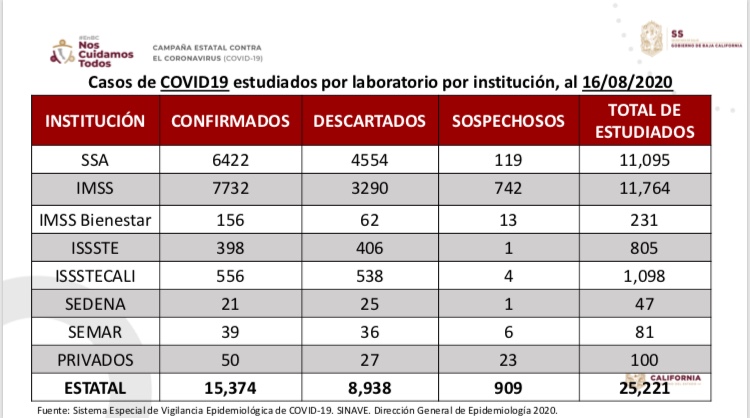 BAJA CALIFORNIA: 2 mil 953 DEFUNCIONES y 15 mil 543 personas infectadas por COVID 19.
