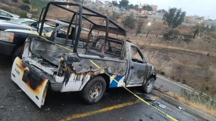 estigos aseguran que sujetos que viajaban en camioneta color negro echaron gasolina a los vehículos de la corporación y les prendieron fuego.