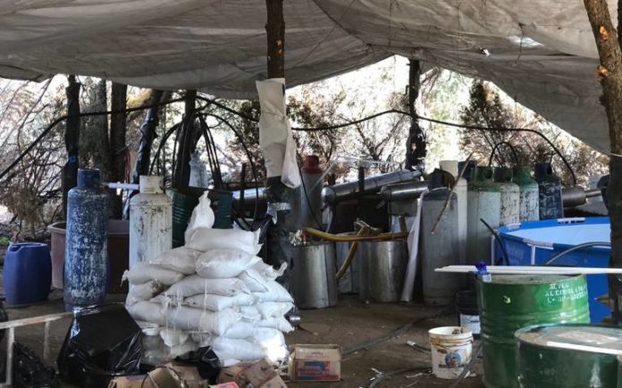 Elementos del Ejército Mexicano, pertenecientes a la Segunda Zona Militar, encontraron un laboratorio entre árboles de pino en el kilómetro 83 de la carretera Tecate-La Rumorosa.