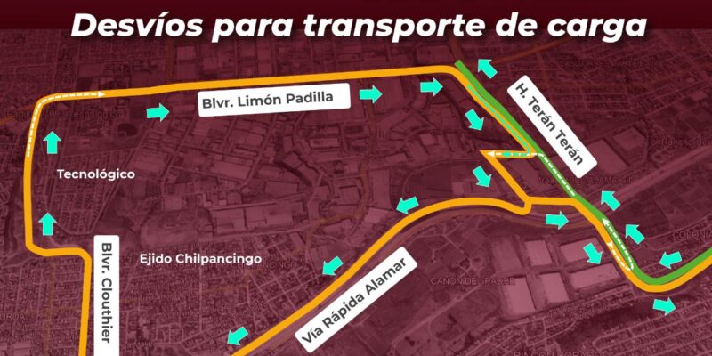 Los camiones que viajen por el bulevar Héctor Terán Terán, tanto en dirección norte como en dirección sur con destino hacia el Poniente por el Bulevar Alamar, deberán tomar la rampa de desvío ubicada en el bulevar Héctor Terán Terán, aproximadamente 500 metros al norte del bulevar Alamar.