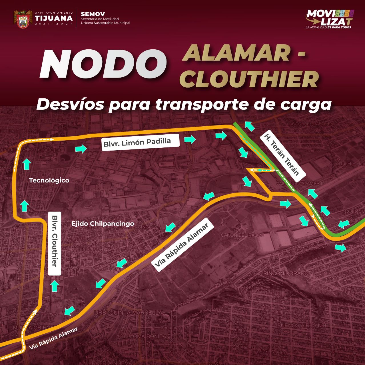El esquema de desvíos propuesto es que los camiones de carga pesada que circulen por Vía Rápida Alamar, hacia el nor-oriente, rumbo a la Garita de Exportación, Zona Industrial de Otay, o a la autopista Tijuana-Tecate, deberán acceder por el bulevar Manuel J. Clouthier, para luego tomar el bulevar Alberto Limón Padilla, en la Zona Industrial de Otay.