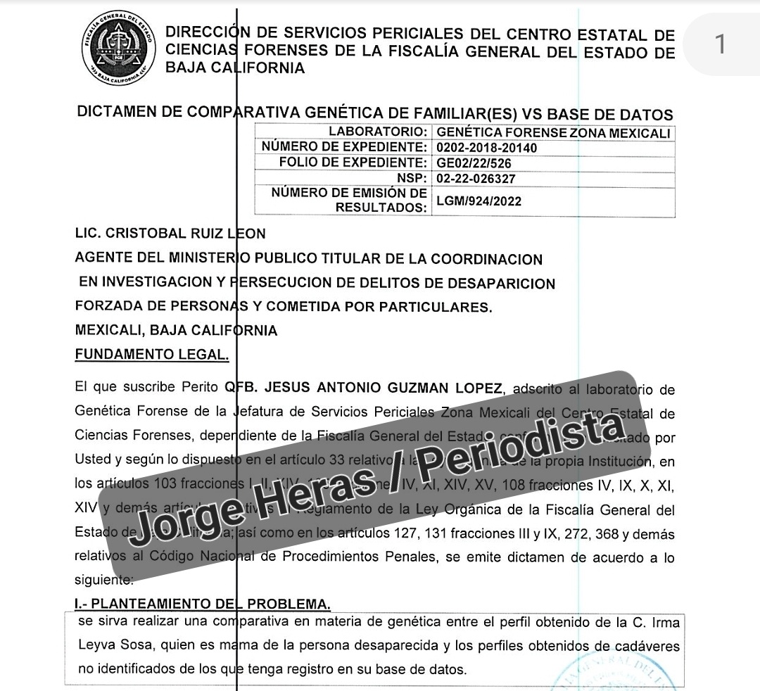 La prueba la realizó el Perito Jesús Antonio Guzmán López de la Jefatura de Servicios Periciales de la Fiscalía de Mexicali, quien validó los resultados del ADN de Irma Leyva con los restos, principalmente la dentadura de su hijo Diego Hernández Leyva.