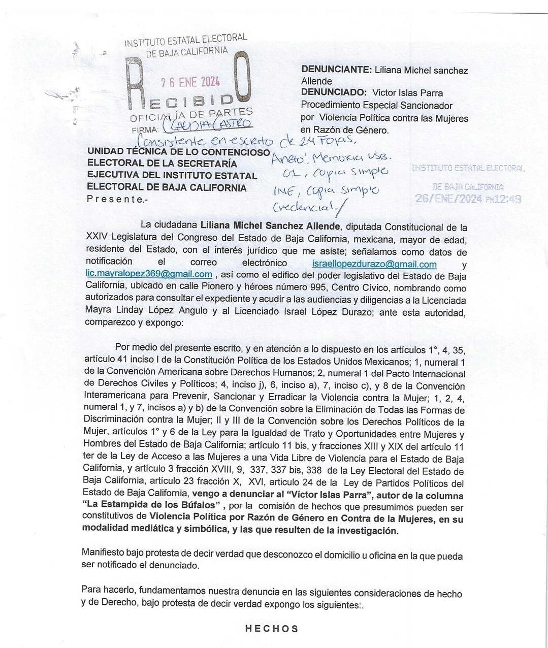 En un documento de 24 hojas, la legisladora morenista acudió al Instituto Estatal Electoral de Baja California para solicitar el inicio de un procedimiento especial sancionatorio por violencia simbólica y mediática.