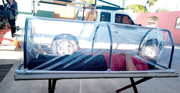 Dichos receptáculos están elaborados con plástico transparente y tubos de Pvc, que se confeccionaron en el propio taller de la asociación civil, y se colocaran en las camillas de los pacientes infectados cuando requieran moverlos de un lugar a otro, evitando así que el personal médico u otros enfermos tenga contacto directo con el paciente.