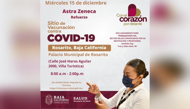 TIJUANA,Baja California, 14 diciembre 2021.- Sitios de vacunación para Tijuana, Tecate y Rosarito para este miércoles 15 de diciembrem para refuerzo de personal educativo, trabajadores del sector salud, refuerzo para adultos mayores de 60 años y menores de 15 a 17 años.