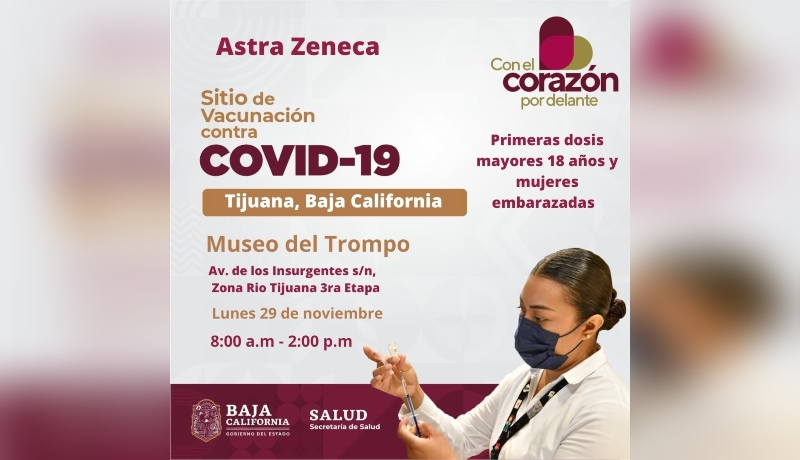Puntos de vacunación peatonales.Horario de atención: 8:00 am a 2:00 pm Museo El Trompo, Av. de los Insurgentes s/n, Zona Rio Tijuana 3ra Etapa