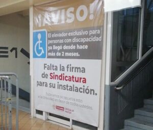 “¡Aviso! El elevador exclusivo para personas con discapacidad ya llegó desde hace más de 2 meses, falta la firma de Sindicatura para su instalación. Esperamos esto se resuelva a la brevedad en favor de todos ustedes” indica la lona.