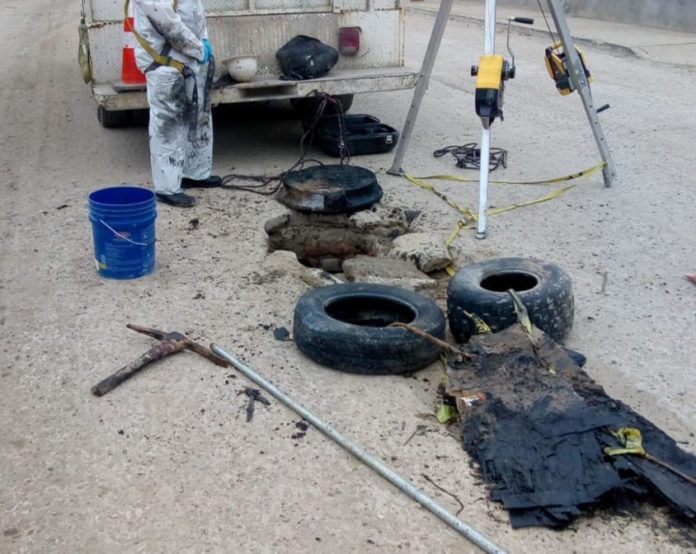 TIJUANA, B. C., a 4 de diciembre de 2019.- Cartones e incluso llantas, fueron localizados tras el servicio de una brigada de trabajadores de la Comisión Estatal de Servicios Públicos de Tijuana (CESPT), pertenecientes al distrito Juan Ojeda, en el Fraccionamiento Otay Magisterial, tras el reporte por parte de la ciudadanía de que en el punto se apreciaba el derrame de aguas negras.