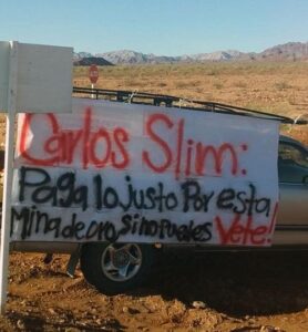Durante la mañana de este miércoles, los ejidatarios cerraron con sus vehículos el paso de los autobuses llenos de trabajadores de la mina, y colocaron mantas y lonas con las consignas «Ejidatarios unidos luchando por lo que vale lo nuestro» y «Carlos Slim: Paga lo justo por esta mina de oro, si no puede vete».