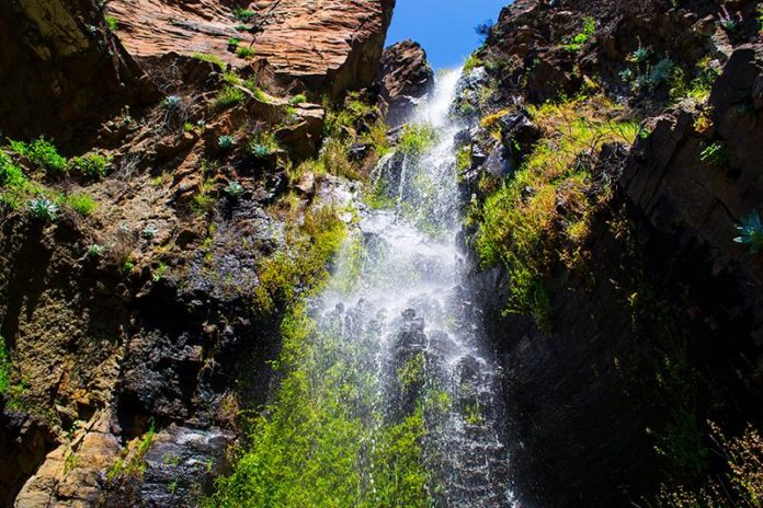 Playas de Rosarito,ABRIL 2020/- Entre el municipio de Ensenada y el de Rosarito aquí en Baja California, después de caminar un par de horas entre arroyos, piedras y una vasta cantidad de flora nativa anunciando la primavera, de manera fortuita como cualquier día, nos apareció una bella cascada al fondo de un cañón, a unos 240 msnm y con unos 40 metros de caída. Sobre ella existe un lago y un represo, que al parecer todo el año contiene agua.