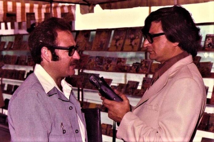 1981.- El periodista Ricardo Acevedo Ramírez entrevistando al librero Alfonso López Camacho (Librería El Día) en la II Feria del Libro de Tijuana realizada en la calle Octava.