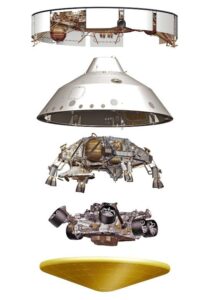 Perseverance llegará a Marte protegido por una cápsula en forma de cono, que también contiene la «grúa celestial» o estructura con retrocohetes, y un escudo térmico.