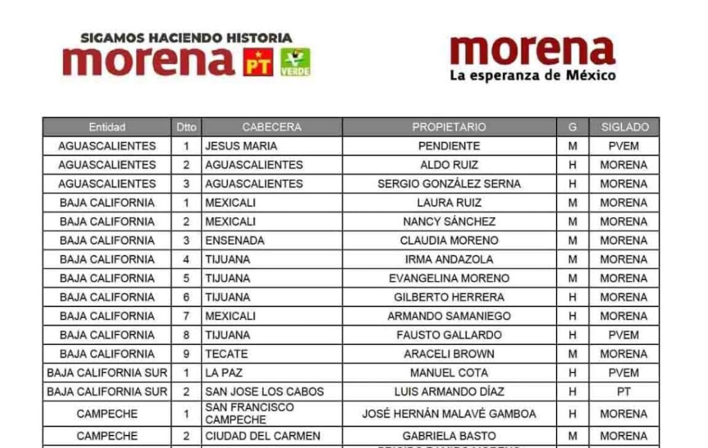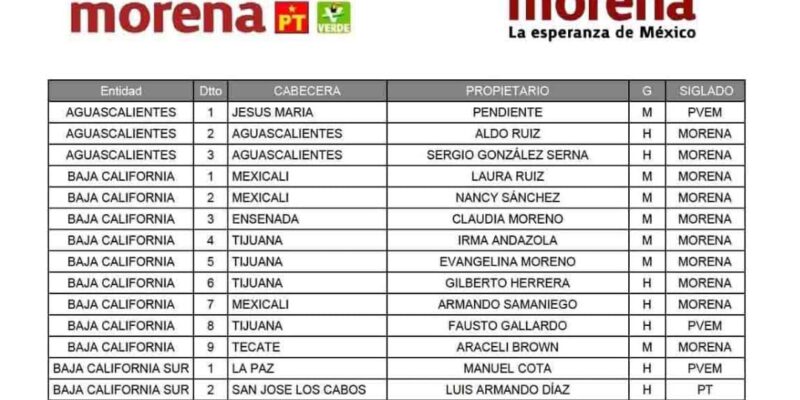 En la lista de candidaturas se encuentra Laura Ruiz -funcionaria municipal del Bienestar en Mexicali, la senadora Nancy Sánchez Arredondo -exdirigente estatal del PRI-, Claudia Moreno -funcionaria de la Secretaría estatal de Inclusión Social-, las diputadas federales que buscan reelegirse Irma Andazola y Evangelina Moreno, y la alcaldesa de Playas de Rosarito Araceli Brown.