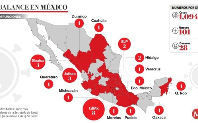 Los casos confirmados del nuevo coronavirus llegaron a mil 94 en México y las muertes ascendieron a 28, informó este lunes la Secretaría de Salud.