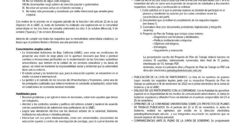 Otros requisitos para ocupar el máximo cargo de la UABC son: ser profesor(a) o investigador(a) de la Universidad con antigüedad no menor de cinco años inmediatos anteriores al día de la elección; no ser ministro(a) de algún culto religioso, ni desempeñar cargo público de elección popular o gubernativo; no estar en servicio activo en el Ejército Nacional, y no haber tenido proceso y condena por delito intencional que amerite pena corporal.