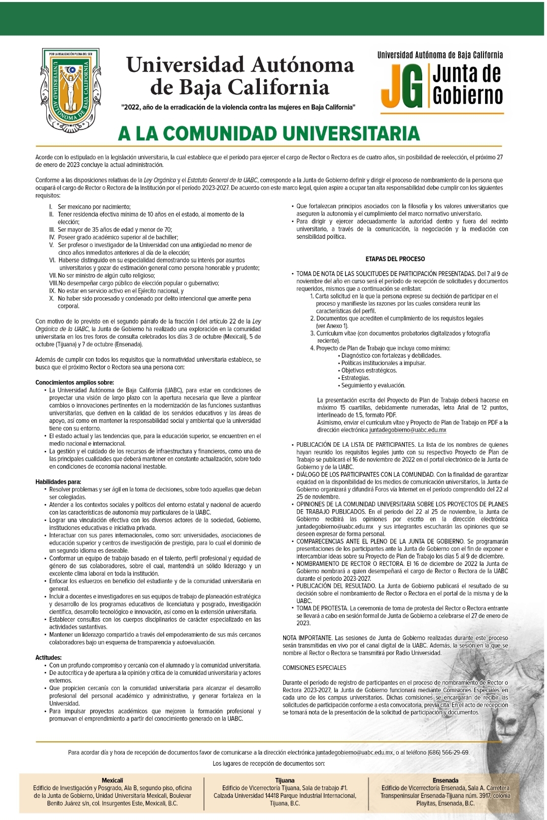 Emiten convocatoria para elegir rector de la Universidad Autónoma de Baja California(UABC)