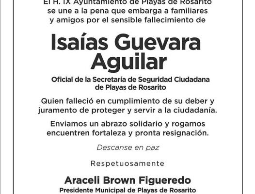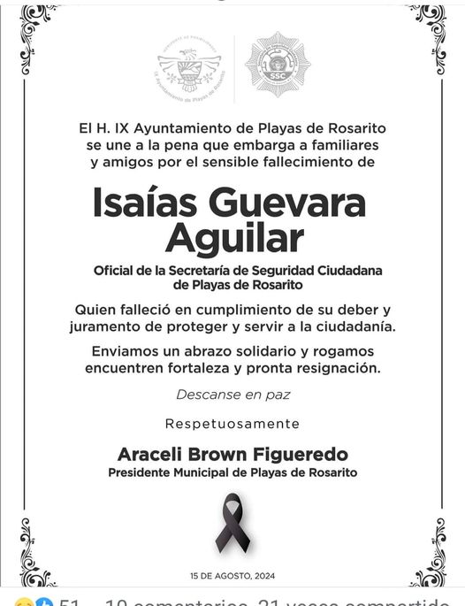 Playas de Rosarito, 14 agosto 2024.- A las 21 horas del miércoles fue asesinado a balazos un policía municipal ,a la altura del arco lector en la entrada a Playas de Rosarito en la colonia Plan Libertador, identificado como Isaías Guevara Aguilar, el cual debido a las lesiones murió en el lugar.