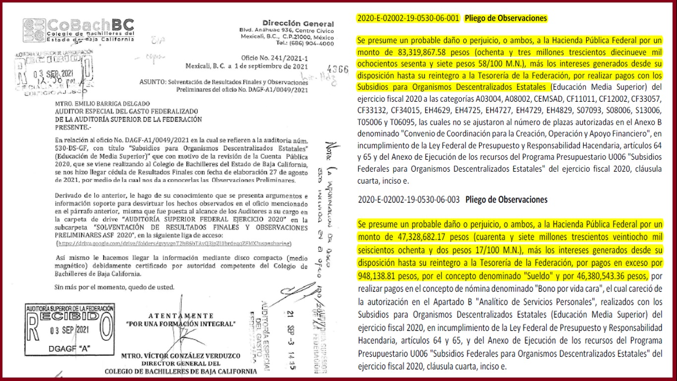 En ese sentido, a través de la auditoría de cumplimiento: 2020-E-02002-19-0530-2021 530-DS-GF, ASF informó de las irregularidades detectadas y notificó en septiembre de 2021 a Víctor González Verduzco, director del COBACH.