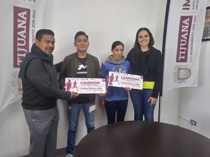 Tijuana, 31 de diciembre de 2019.– Los corredores Mario Martínez y Andrea Jarillo, recibieron la recompensa que los acredita como campeones del Serial Atlético Delegacional 2019 de manos de la secretaria del Bienestar, Gabriela Farías, y del director del Instituto Municipal dl Deporte, (Imdet), Juan Carlos Pelayo.