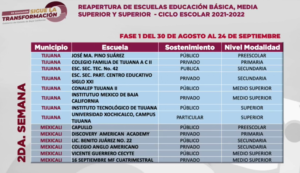 Las escuelas privadas que permitirán la presencia de alumnos son el preescolar del Instituto Anáhuac, la primaria del Instituto Ramiro Kolbe en Presidentes, la secundaria del Instituto Colinas Kolbe, la preparatoria Cubres y la Universidad Internacional de las Californias.