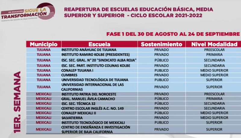 Las escuelas privadas que permitirán la presencia de alumnos son el preescolar del Instituto Anáhuac, la primaria del Instituto Ramiro Kolbe en Presidentes, la secundaria del Instituto Colinas Kolbe, la preparatoria Cubres y la Universidad Internacional de las Californias.