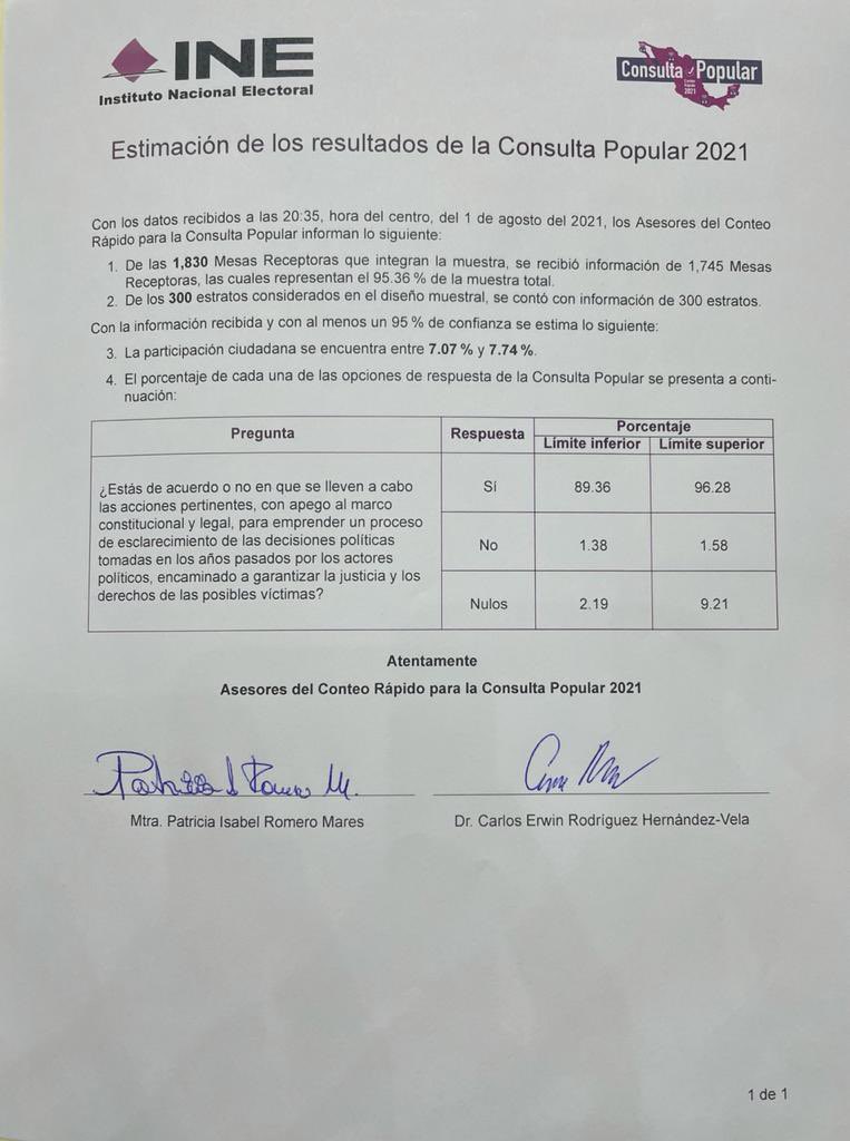 En tanto, respecto al resultado de la votación, entre el 89.36 y el 96.28 por ciento votaron por el “Sí”, es decir, para investigar crímenes cometidos por los titulares del Ejecutivo en los sexenios pasados. Mientras que entre el 1.38 y el 1.58 por ciento votaron por el “No”, según el conteo rápido del árbitro electoral.