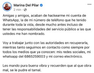 MEXICALI,BAJA CALIFORNIA,26 marzo 2022.-El gobierno del estado informa que la cuenta de WhatsApp personal de la Gobernadora de Baja California, Marina del Pilar Ávila Olmeda, fue objeto de un ataque cibernético durante la mañana de este sábado 26 de marzo.