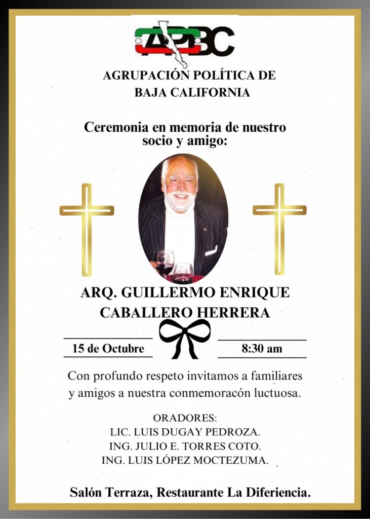 TIJUANA,BAJA CALIFORNIA,15 octubre 2025.- El miércoles la APBC rindió homenaje postumo al arquitecto, Guillermo Caaballero Herrera .En el acto estuvieron su familia y se destacaron sus obras como el diseño del palacio de Tijuana en 1984 y también fue fundador de colegios de arquitectura enTijuana.