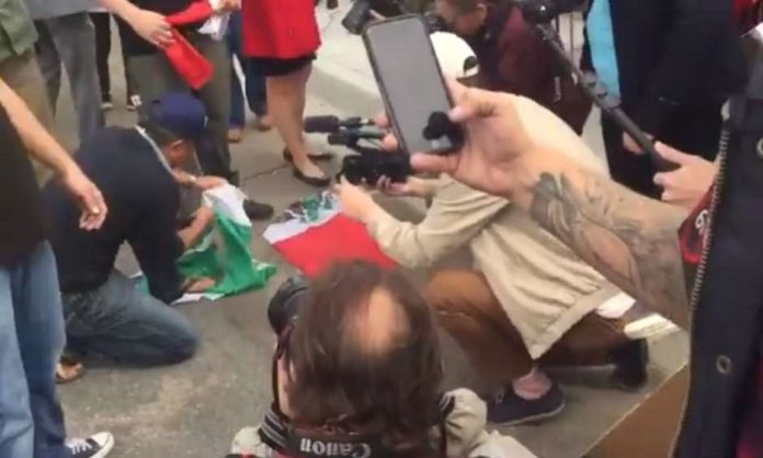 San Diego, California, marzo 14 (El DiarioNY).- El viaje del presidente Donald Trump a California para visitar los prototipos del muro fronterizo con México generó protestas a su favor y en contra. Un grupo que lo apoya tomó una bandera de México y la hizo tirones al tiempo que gritaban: “Jódanse mexicanos, esto es América”.