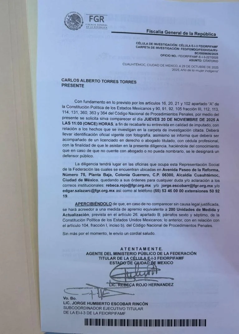 El citatorio exige la comparecencia de Torres Torres en las oficinas centrales de la FGR, ubicadas en Avenida Paseo de la Reforma, en la Ciudad de México, acompañados de un abogado y documentos de identificación oficial.