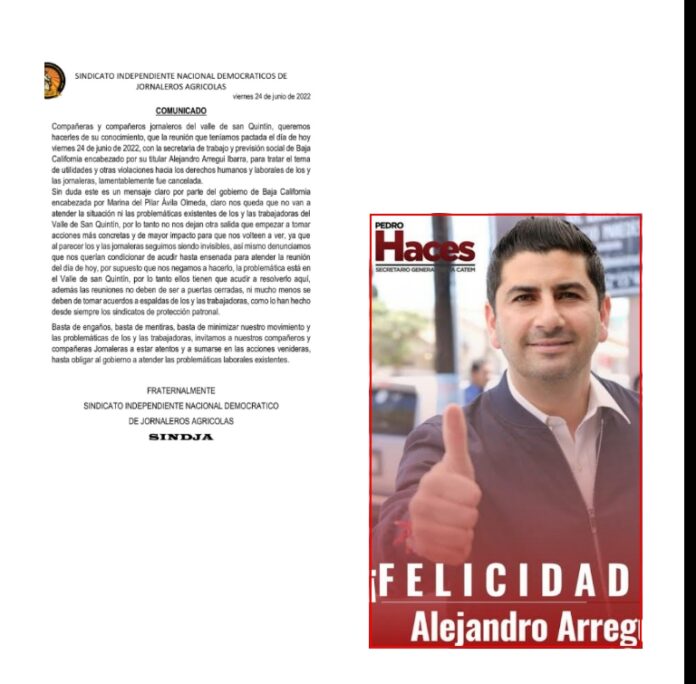 Ante la actitud laxa e irresponsable de Alejandro Arregui Ibarra y sus subordinados, los integrantes del Sindicato Nacional Independiente de Jornaleros Agrícolas, tomaron la decisión de emitir un comunicado informativo para sus agremiados en el que señalaron que, la reunión programada fue cancelada y que esto era sin duda un mensaje claro del gobierno de Baja California que encabeza Marina del Pilar Ávila Olmeda, de que no atenderían la problemática existente de los y las trabajadores del Valle de San Quintín, lo que los orilla a tomar acciones concretas y de mayor impacto para que los obligue a voltear a verlos, ya que al parecer para ellos siguen siendo invisibles.