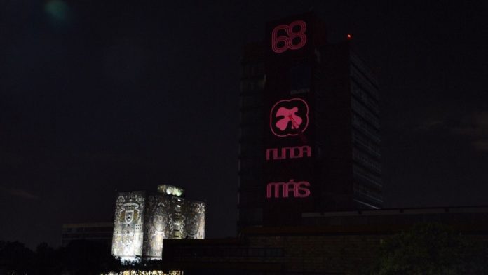 La UNAM apagó esta noche las luces del edificio de Rectoría y proyectó en su fachada el mensaje «Nunca Más», acompañado de una instalación lumínica, que muestra la icónica imagen del 68 y la de la paloma de la Paz atravesada por la punta de una Bayoneta.