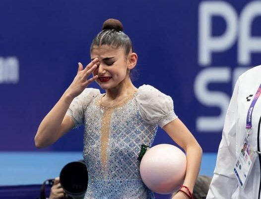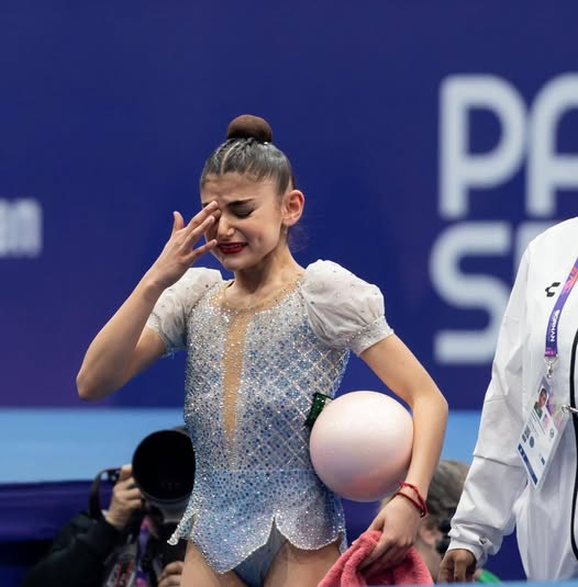 Su momento llegó en la prueba individual de pelota. Cada giro, cada lanzamiento y cada movimiento parecían sincronizados con algo más grande que ella. La rutina fue precisa, elegante y tan emocionante que, cuando terminó, no solo ella tenía lágrimas en los ojos: también las tenía el público que la ovacionaba de pie.